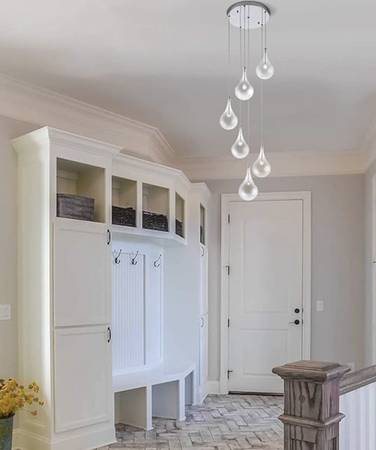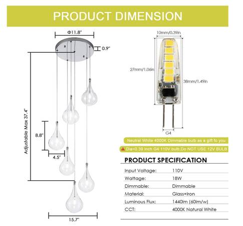 Cluster Chandelier with 6 Glass Raindrop Glass Shade Pendant Lighting Fixture see pic for dimension. included are two sets of bulbs (neutral white/daylight and warm/soft - see pics; lights bulbs are...