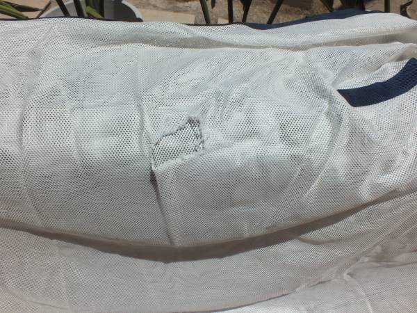 State Line Tack 82" horse fly sheet, white with blue trim. Good condition overall, has one hole on the left side which could be repaired. 100% polyester. $10. Selling multiple horse-related items,...