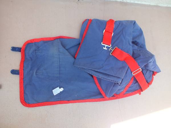 Brand is Perforated Pad Company. 80" horse sheet in good condition, has been repaired. Blue with red trim. Tags do not list the fabric, feels like cotton or possibly poly/cotton blend. $35.