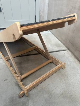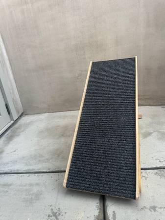 Sturdy dog ramp in natural wood color + dark carpet for traction. Height settings as follows: 25”, 23”, 20.5”, 18.5”, 16.5”, 14.5” Good condition. Some bit marks from my dog, as shown in photos, but...