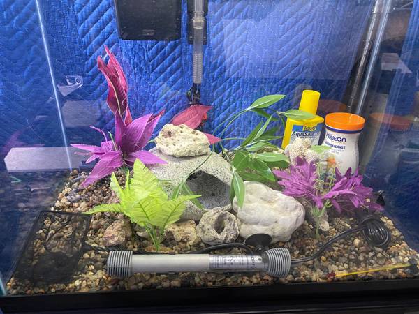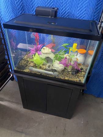 20g glass aquarium fish tank (17"H x 24"L x 13"W) with solid wood cabinet (25"H). Lid with LED lights, HOB filter, fake plants, large cave and rocks, gravel, heater, net, fish food and everything else shown in photo.