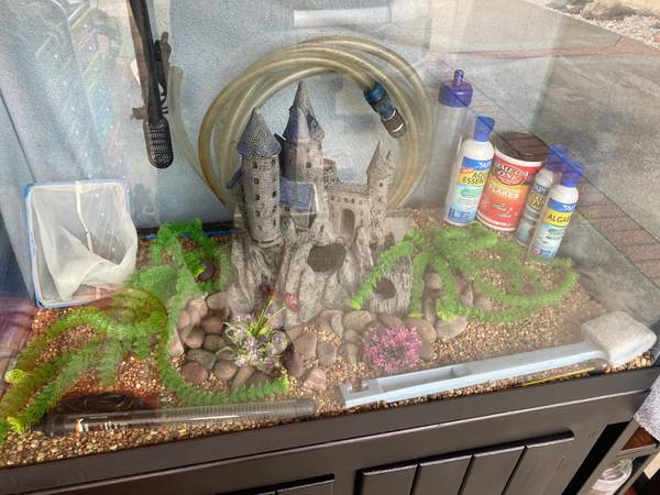 70 gallons glass aquarium (25"H x 18"Dx 36"W) with wood stand (28"H), LED, heater, scrubber, Large beautiful castle, rocks and gravel, HOB filter, fake plants, net, water changer, medication and fish foods.