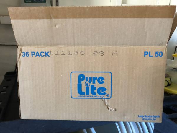 Pure Lite liquid paraffin fuel cells. Paraffin Lamp Oil - Clear, Smokeless, Odorless, Clean Burning Fuel for Indoor and Outdoor Use. Each bottle is 3 1/2 inches tall and 2 1/2 inches wide and will burn for 50 hours or more. Case of 36 is $150.00 or each single bottle is $5.00. Brand new and never used.