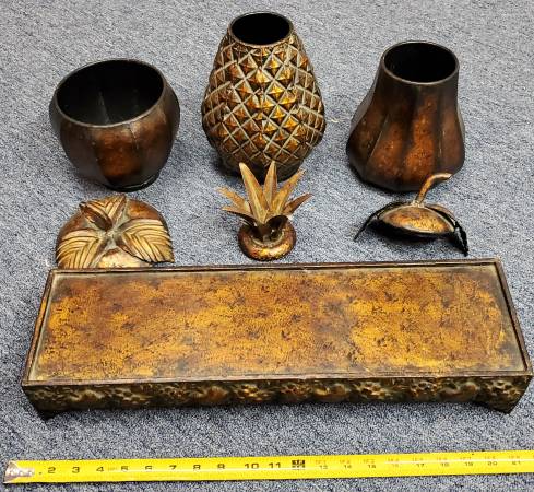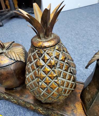 Decorative Set of 3 Larger Distressed Bronze Finished Jars/Urns in Fruit Design On A Long Footed Platter These were purchased from a high end retail store a few years ago. Apple, Pineapple, Pear....