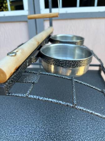 Beautiful like new bird cage. Charcoal color. Bar spacing 1 inch. Comes with stainless steel food dishes, dowel. Large door opening. Durable, secure door latch. Wheels can lock/unlock. Top of cage has very versatile play area encouraging activity. Swing, dowel, and stainless steele dish’s. Cage includes 4 extended metal seed guards.