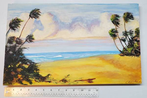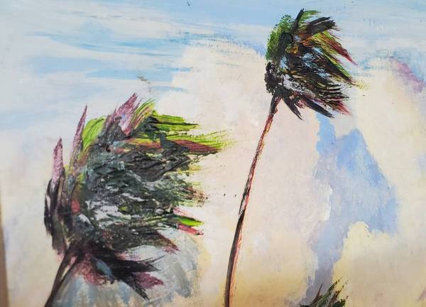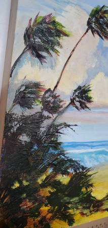 Wonderful seaside painting of palms blowing in a strong wind. Signed "Christine". Painted on wood board.