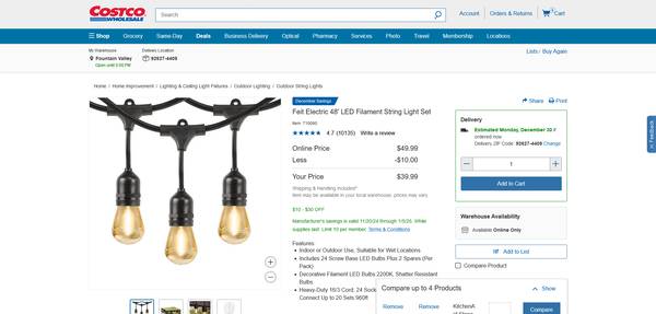 OUTDOOR 24 STRING LIGHTS 48 FEET - NEW IN BOXES FROM COSTCO. $40 PER 48 FOOT BOX. I USED TO BUY TRUCKLOADS OF OVERSTOCK, DISCONTINUED AND RETURNED ITEMS FROM COSTCO AND NOW I'M CLEARING OUT THE...