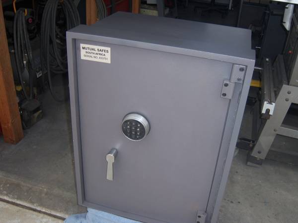Mutual High Security Safe. High Quality Safe. Outside measurements are: approx. 23"wide x 17" x 30" tall. Weight estimated at 300+ pounds. Has Lagard electronic lock. Code and easy code change instructions are included. Body constructed of heavy plate-steel. Door made of 1/2" steel. Commercial grade safe.