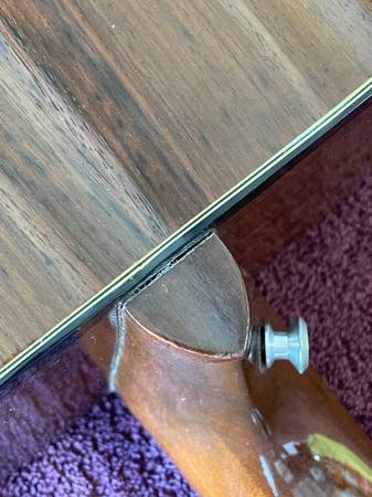 There is minor cosmetic finish and binding separation at the heel/body junction, typical of vintage Gibson acoustics due to natural wood movement and nitrocellulose lacquer shrinkage. The neck joint appears solid and stable, with no cracks or structural separation noted. This does not affect playability or structural integrity.