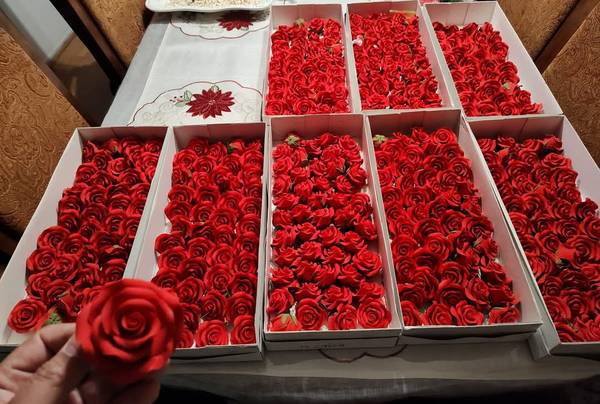 Gum paste flowers for sale to decorate cakes etc. set up a table outside my front porch so customers can see the flowers mote comfortable than going inside my house.