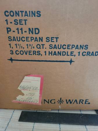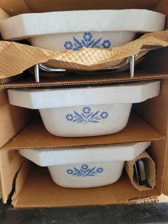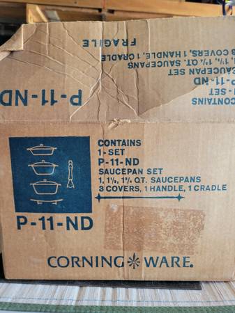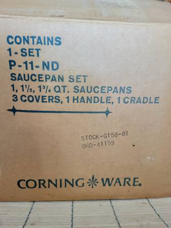 Brand new in original box Corning Ware Sauce pan set in MINT Condition. Blue Cornflower 1, 1 1/2, 1 3/4 qt. Sauce pan 3 covers, 1 handle, 1 cradle $115.00 cash