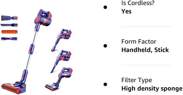 【8 IN 1 CORDLESS VACUUM】Owning one gives you a cordless stick vacuum and a handheld carpet floor cleaner. With multi-functional accessories, you can reach under low furniture or up high to clean curtains, ceiling moldings, and light fixtures.