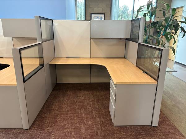 We have (30) AIS 6'x6' cubicles available. All in good condition. Two tone tan fabric. Lots of glass. Includes one file & one overhead storage cabinet.