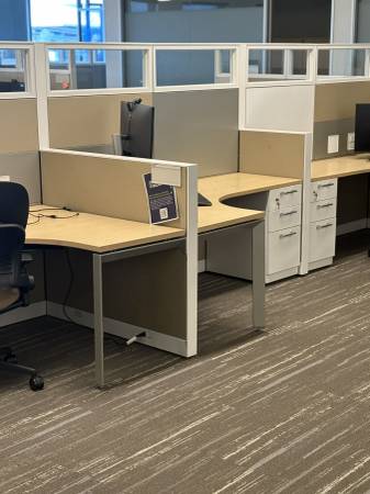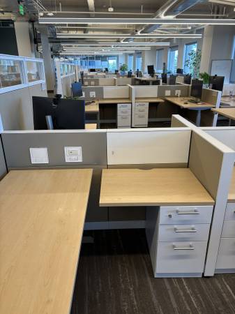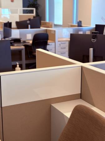 Large matching set of Steelcase Answer workstations. Mix of 6×6 and 5.5×6 with 42" low walls and 65" aisle spines; about 30% (or more) with glass. Power/data tiles, pedestals, L-desks. Professionally pre-owned—cleaned, inspected, reconfigured to your floor plan. Multiple sections across five floors for phased installs.