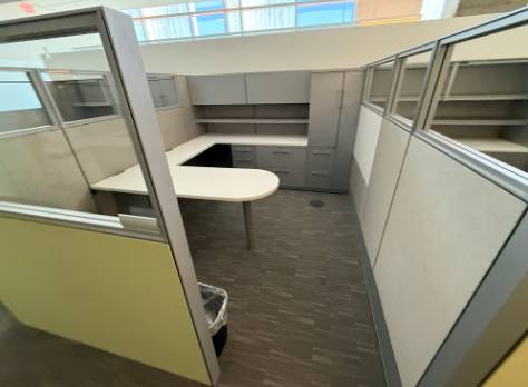 We have these Haworth Compose Manager stations that are in excellent condition that are standard in 8'x10'x65" with glass panels and wing. The spline is (2) 36" panels and (1) 24" panel. The Spline has (2) 36" overheads, (1) BBF Pedestal, (1) Lateral File and (1) 24" storage tower. Coming down the aisles way panels the sizes are (1) 24", (1) 30" & (2) 42" panels. The wing panel is 60" and with glass. The surfaces are 6'x30" Bullet top desk, 42"x24" return and 72"x24" credenza. The fabric is accented exterior with neutral and the trim silver with the surfaces being white.