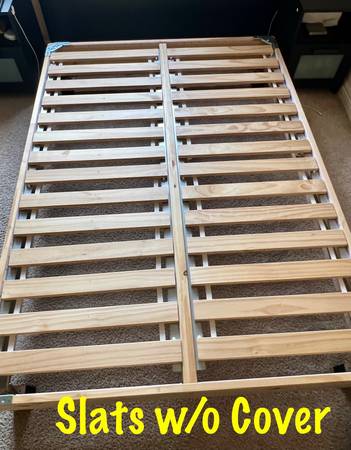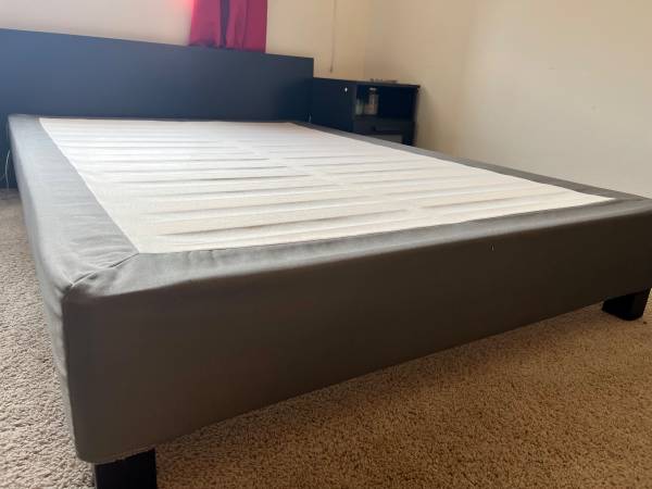 ▪️FULL SIZE MATTRESS - CLEAN ▪️STURDY BASE HAS SLATS / DARK GRAY COVER / ALL PARTS [Currently broken down for transport / Easy to put together] Measures: 74.5” long x 53” wide ▪️ LOW PROFILE BLACK...