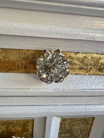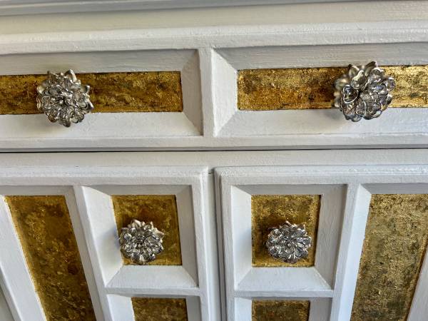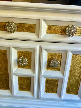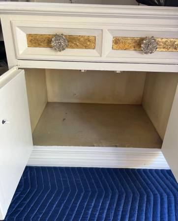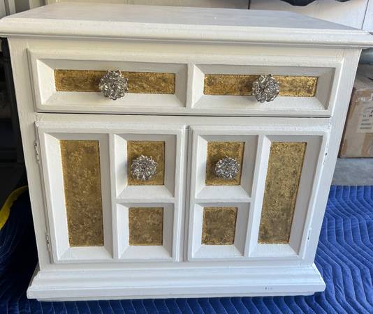 Two white and gold nightstands/end tables with flower handle pulls ▪︎ Width: 14” x 14” ▪︎ Height: 28-1/4” ▪︎ Pick up in Aliso Viejo ★ $99 Firm (handle pulls alone cost that) - Cash Only