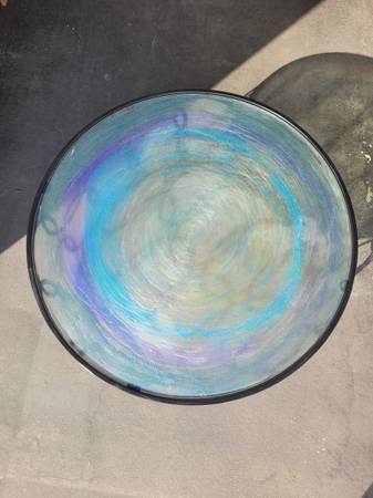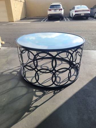 This is a really cool coffee/end table. Metal ringed base with a big glass top. Base has been painted and sealed. Glass has colored resin on the bottom side. Measures appx. 18"H x 32"W Message with...