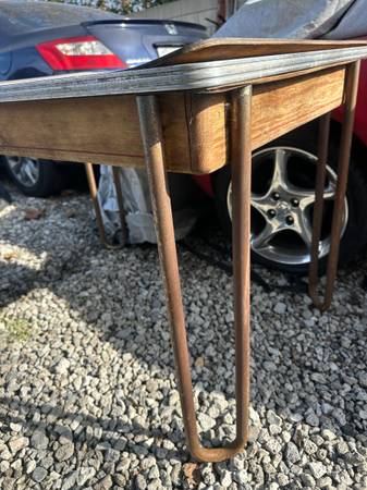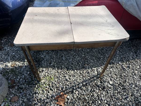 You are looking at a 1950’s kitchen table that will need a new top, possibly other work. Chrome Hair pin legs.
