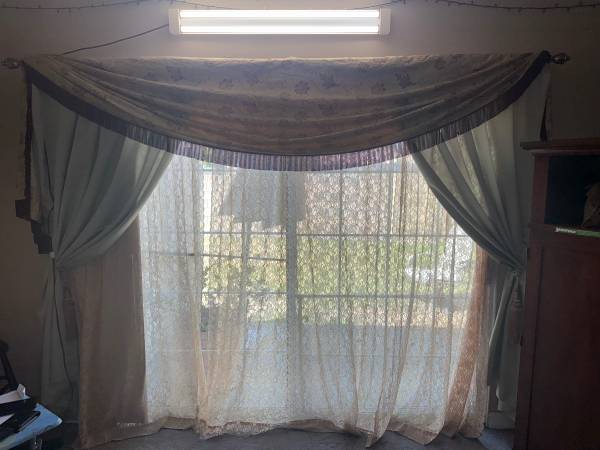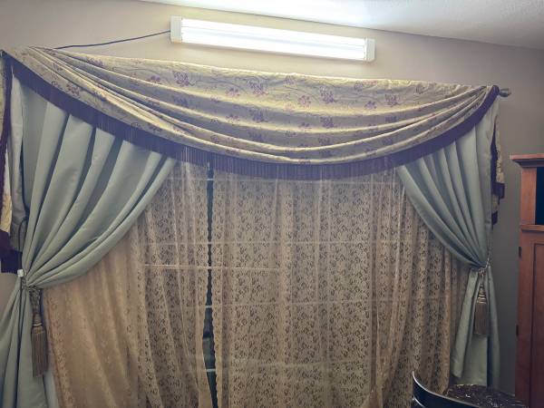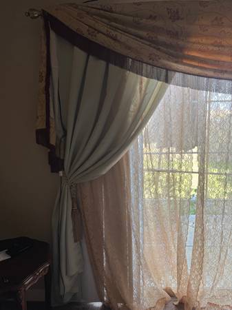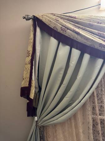 Beautiful curtains 9 pieces 3 net curtains 2 long curtains 1 valance curtains 2 tussles 1 Curtain rods (cost $100) High quality fabric costs $700 Selling for only $145 obo Easy to assemble If the ad...