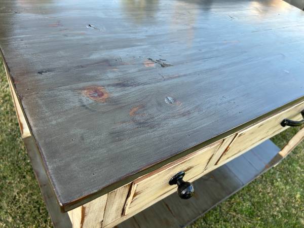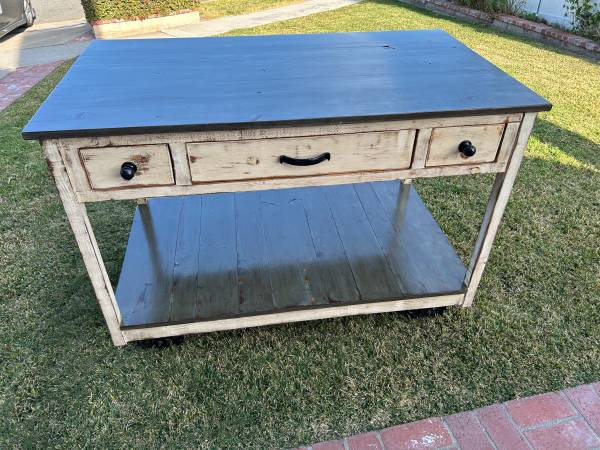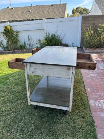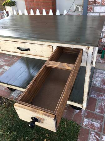 I made this table designed for an art room. The wife can no longer use it. It was designed to be accessed from both sides so the drawers will open from either side. The drawers are full pull and removeable. The table is made of pine and painted & stained to it finish. It has one large center drawer and two smaller outer drawers. The wheels are metal. Dimensions are 50"Long X 28.5" Wide X 36" Tall. This is a one-of-a-kind table so message me if interested. I design my own furniture and make a lot of items with hidden compartments. Let me know if you have questions. Call or text me @ 714-32two-057two, Ken
