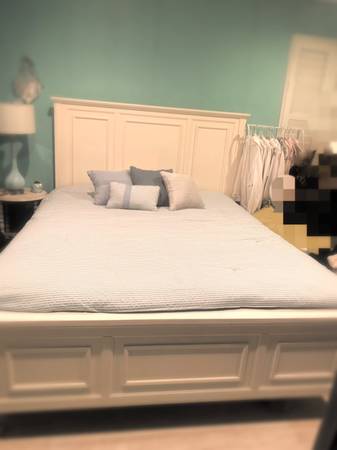 King Size-White bed frame that delivers style to your bedroom! It comes with rectangular panel headboard, a box spring and king size memory foam mattress! This firm mattress provides more support for your spine, helps reduce pain in the lower back and is super comfortable! Located in Anaheim
