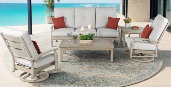 High quality patio outdoor aluminum deep seating set, Sunbrella cushions Brand: Heritage Outdoor Living Condition: New in box Set includes: 1- Sofa with Sunbrella cushions. 2- Swivel rocker club...