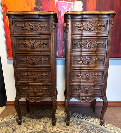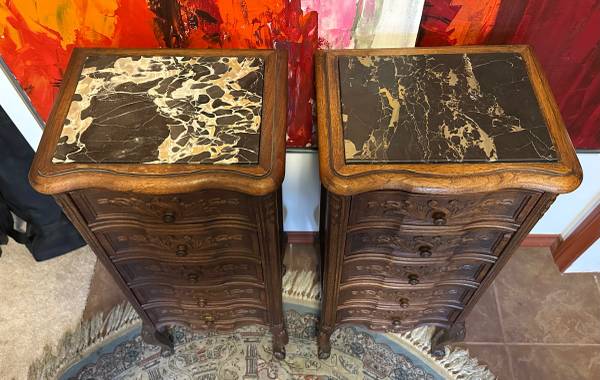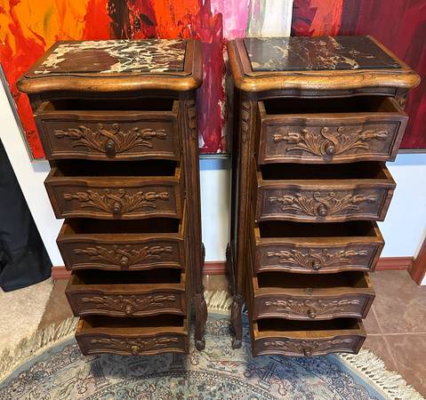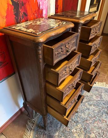 You are looking at a Pair of Victorian Style, Mahogany, Chippendale - esk ,Marble Top, Lingerie Chest of Drawers. Each chest has 5 drawers. They measure 14-1/2” wide by 11-1/2” deep by 36-1/2” tall....