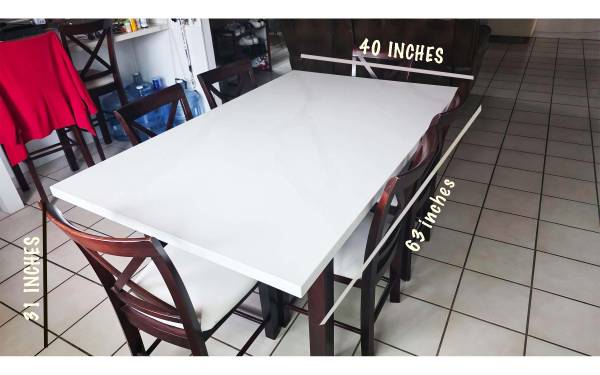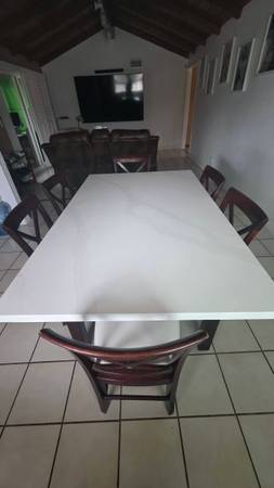 For sale: Quartz dining table (40" wide, 63" long, 31" high) with a durable solid wood base. The set includes six dining chairs and two bar stools, totaling eight chairs. The dark espresso brown finish features a modern urban design. All pieces are in excellent condition and just one year old. Price: $245 OB for the entire set. Don’t miss out!