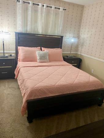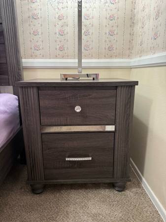 1 Nightstand has 2 drawers, along with an elegant modern chandelier table lamp.