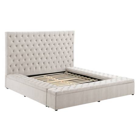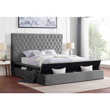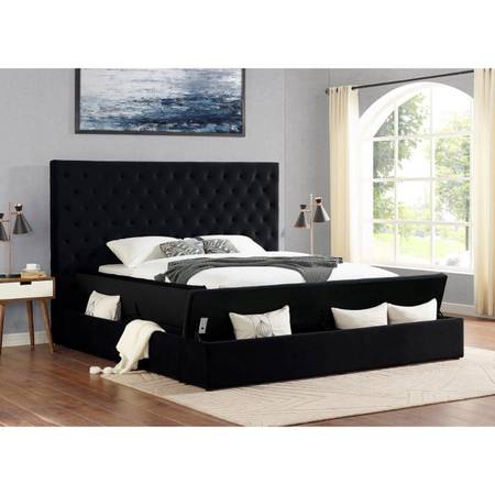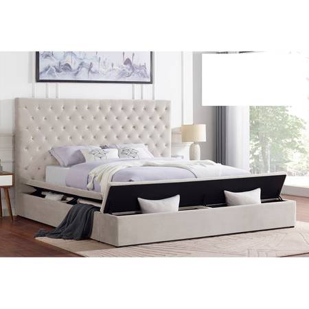 Brand new in a box delivered directly from the manufacturer. NO SHOWROOM Delivery Available Pay CASH, Zelle, Or Apple Pay at delivery. Tufted velvet upholstered bed features storage on each size....