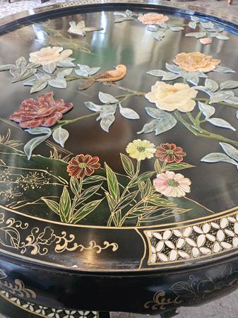 Vintage Asian Bird Motif Coffee Tea Table with 4 Stools 36"D 21"H Included is the glass top, there is wear and chips throughout this piece but the carved pieces are intact $250 as is used antique...
