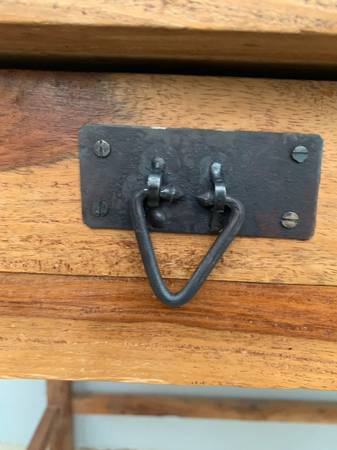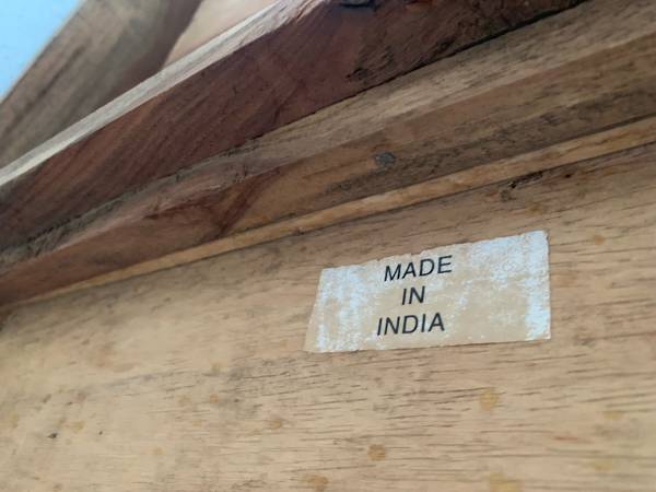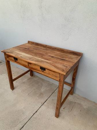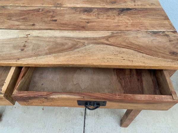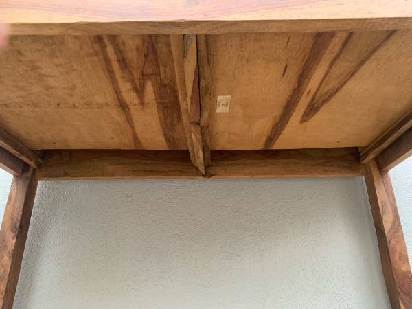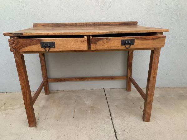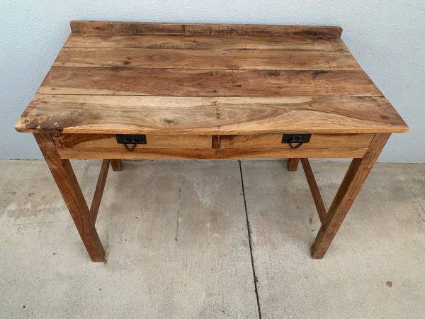 Mid Century Original and Unrestored Solid Pinewood Desk / Console Table with a Ton of Character! Amazing Raw Pinewood Planks with Gorgeous Veins and Coloring Throughout As Shown in Pictures! Made in India and Labeled as Such. Looks to Be From the 60’s or 70’s.