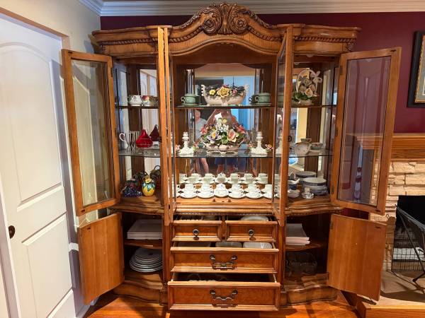 As a result, we are selling this China Cabinet. It's a 2 piece furniture with a top, glass enclosure with glass shelves and lighting inside, and a bottom, 4 drawer with 2 side opening storage space.