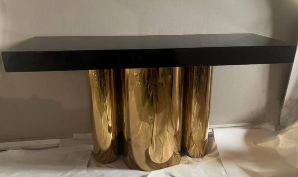 The Rockwell console by Mitchell Gold + Bob Williams conjures midcentury swank with a base formed from a single undulating sheet of polished brass crowned by a robust slab of black quartz. Measures:...