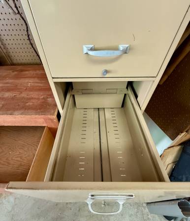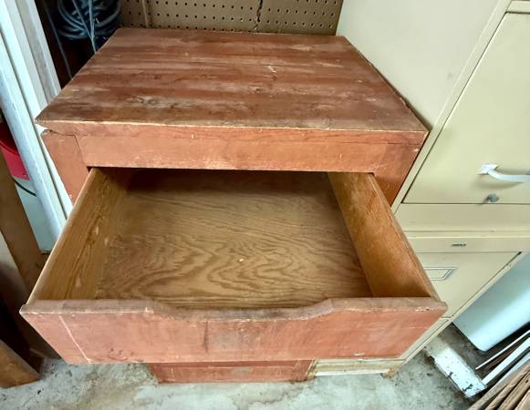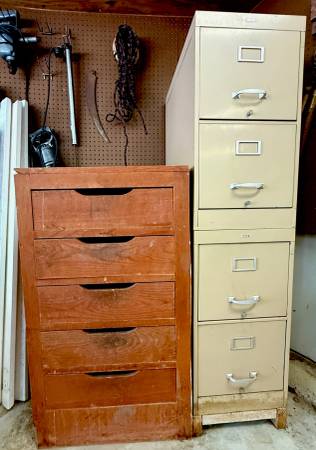 Two 2-drawer metal filing cabinets: $5 each One 5-drawer wood utility cabinet: $5 All three: $10 Wood 40.5"h x 23.5"w x 22.5"d Metal (each) 28"h x 15"w x 24"d