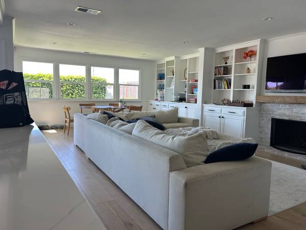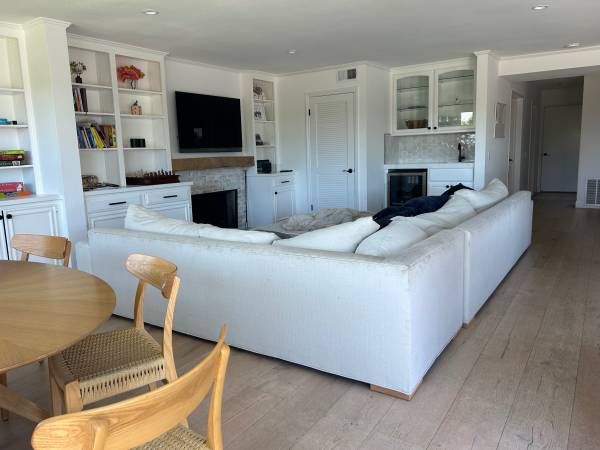 Light beige linen fabric on sectional and ottoman