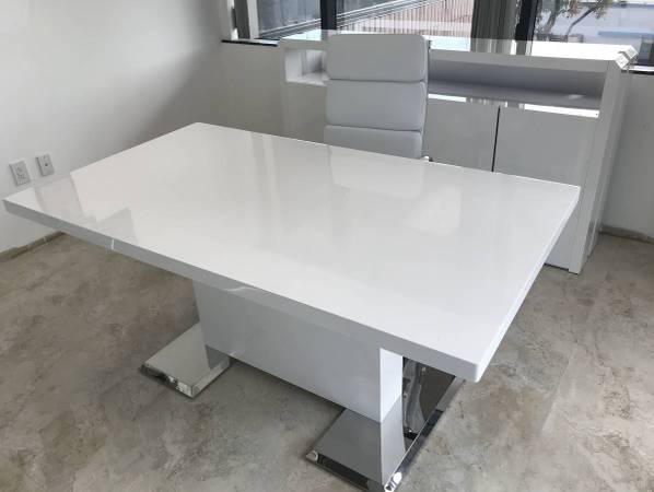 The white shiny desk is made of solid wood and finished in a modern white automotive finish with modern chrome accents at the base/feet. These desk can also be used as modular (placed together) for work groups.