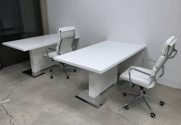 We currently have 10 desk sets left (Desk and office chair) and of the 10, 5 sets are new in box. Price of $695 is for one desk and chair. We also have other white office furniture for sale i.e. conference table, accents chair, bookshelf etc (from our current/old office - “one offs”). We are a promotional marketing firm and not a furniture store, so all viewings must be made via appointment.