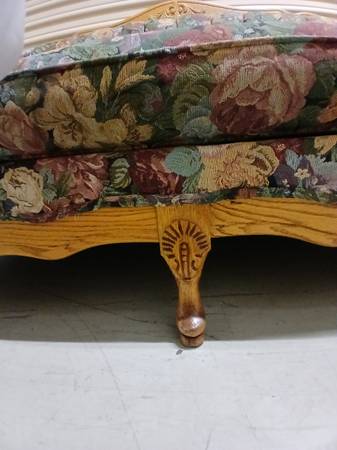 Really nice floral design. Wood is perfect. Very comfy and well-built. It is heavy for its size! Has only been used in 1 room, but needs a quick upholstery cleaning. If you don't want leather and have some antiques, this is a great choice.