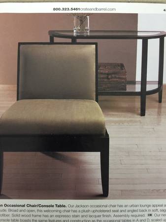 Images are from the Crate & Barrel Jackson & Cordova Collection catalog. 1 chair as shown and 1 matching ottoman (not shown), all in like new condition. (never used). Glass table behind chair is not included. Both matching tables are in like new condition also. $995.00 for all 5 pieces. Willing to sell separately.