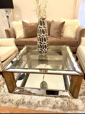 Z Gallerie vintage mirror pasqual coffee table in excellent like new condition. Solid wood frame is hand distressed with a metallic champagne finish and inset with antiqued mirror.