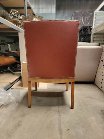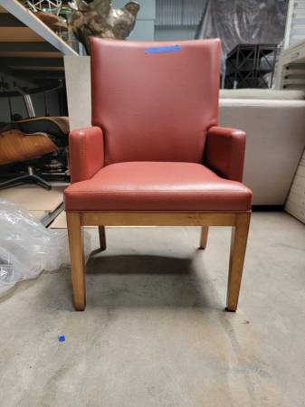 A bold and timeless statement piece! This chair was custom made for a design project and has never been used. Upholstered in rich red leather with a sleek wood frame, it blends luxury with durability.