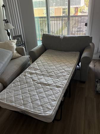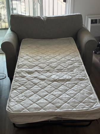THIS LOVE SEAT IS ALSO A PULLOUT TWIN BED. COMES WITH MATTRESS CUSTOM MADE PAID $2200 ASKING $250 SOME WEAR. CAN BE CLEANED REALLY NICE FOR EXTRA COMPANY GREAT IN AN OFFICE MEASURES: 32 X 31 X 52...