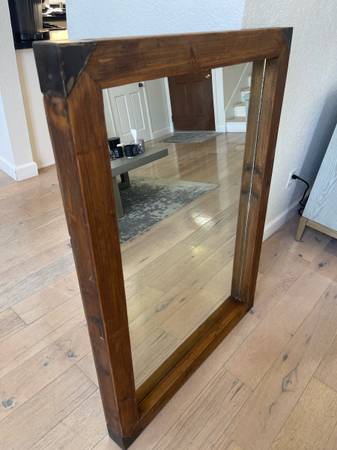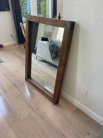Rustic wood wall mirror with metal corner accents. Solid and heavy. Great for entryway or bedroom. Excellent condition.