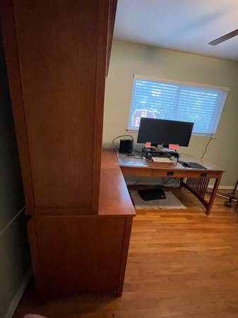 - 34" x 82" Solid desk with drawers on front and back, large cubby for printer and accessories. Glass top protector will be included. Desk is finished on both front face and back with pull handles. Originally paid over $3000, most sturdy construction you'll find.