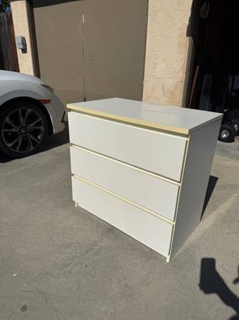Used 3-drawer white IKEA dresser No damage to any parts, just used normal wear and tear. Has only been moved once from office to garage. Ready for pick up. See photos.