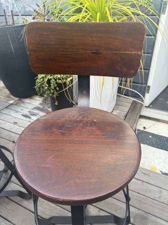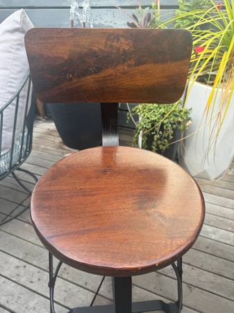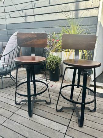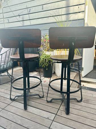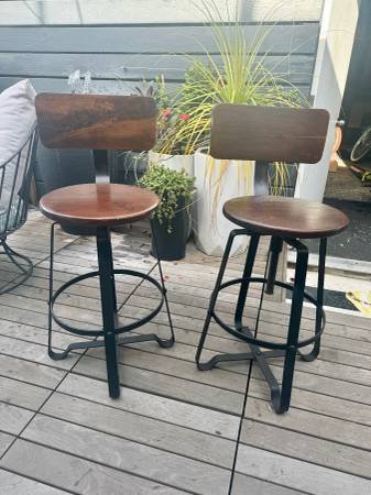 2 vintage style bar stools for sale. Wood and metal, adjustable height, sturdy and in great condition. Perfect for kitchen island, bar or cafe. Price for the pair