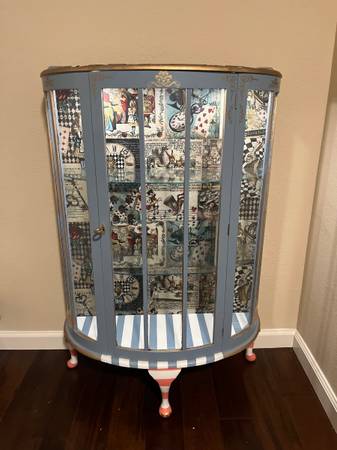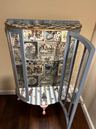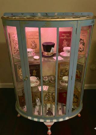 This 1930s antique bow front display cabinet has been reimagined with a whimsical Alice in Wonderland theme