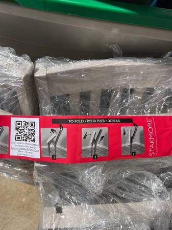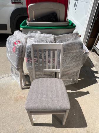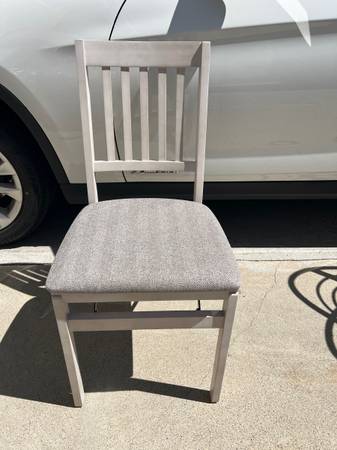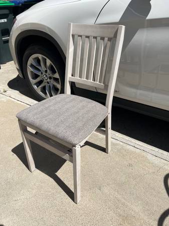 Brand New Stakmore Wood Folding Chairs with Upholstered Seat. Color - light gray / knight flannel. Selling all 4 together for $100. Retails for $233 for 2 chairs.